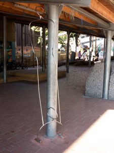 Une silhouette s’appuie sur les épaules d’une autre silhouette pour voir ce qui se passe sous le toit de la cour. En sort une petite foule de silhouettes en couleur, montées en mobile.