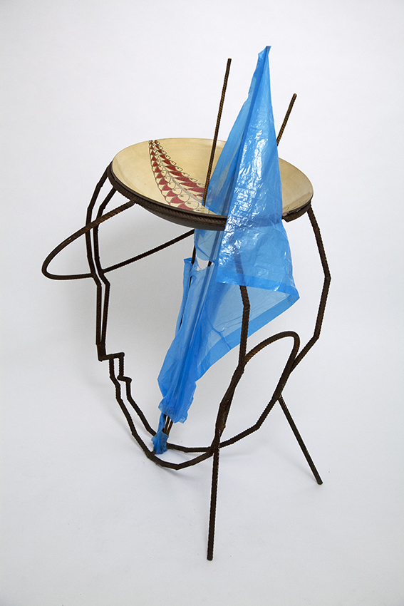 La céramique posée sur le dessus de la tête est coupée en deux, laissant passer le plastique couleur de la mer.