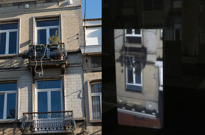 Conception et réalisation d’une silhouette renversée dans le cadre d’une résidence à la Maison des Artistes d’Anderlecht. La silhouette est attachée au balcon d’une maison particulière, en face de la Maison des Artistes, dans laquelle tout le premier étage a été transformé en camera obscura par le duo Patricia Bouteillier, et Charlyne Misplon. La silhouette y est reflétée à l’endroit, sur les murs intérieurs de la Maison. Une silhouette droite dans un monde à l’envers.